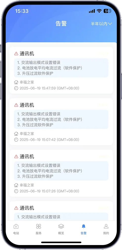 当逆变器故障或出现异常情况时,软件系统会发送报警信息。这些警报旨在提醒用户或维护人员及时采取措施,以避免损失或进一步损坏。