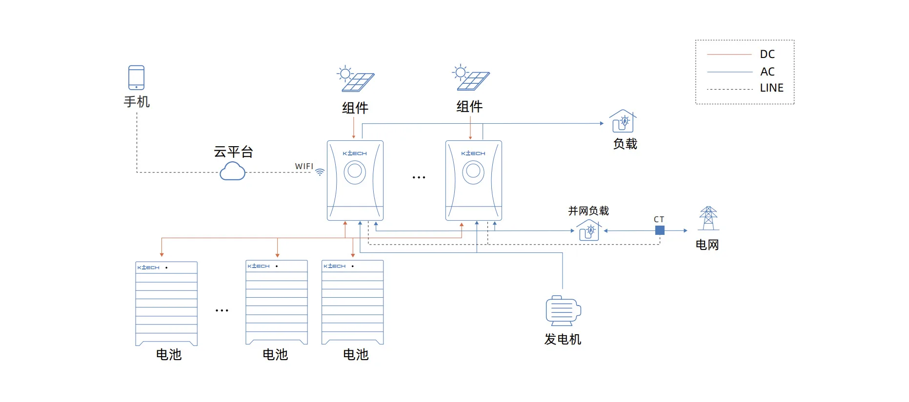本方案可采用 ①“光伏+电池+市电” 或者②“光伏+电池+发电机” 混合供电架构,结合多台逆变器并机技术,实现10kW~72kW功率段灵活扩展,满足小型工商业场景的高负载、长时间运行需求。系统支持光伏优先供电,储能电池削峰填谷,发电机智能备援,并通过智能能源管理平台实现高效调度,显著降低用电成本,保障生产用电连续性。